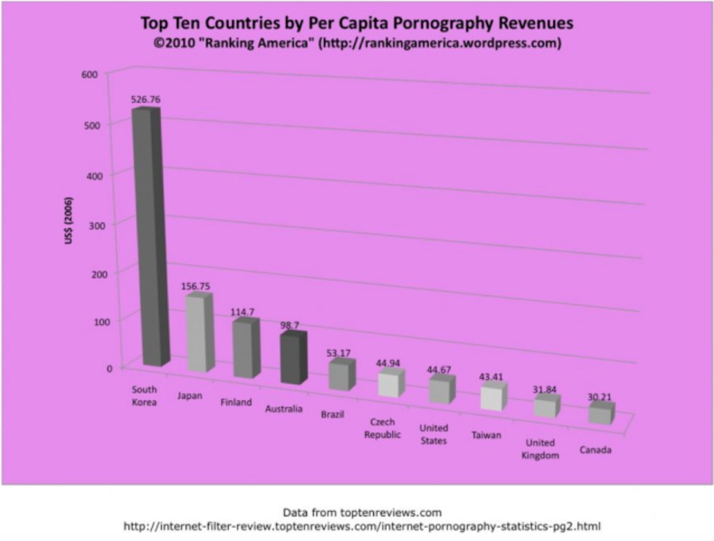 These are the top 10 countries most given to masturbatory lust, based on per capita expenditure on pornography: (1) South Korea ($527 per capita). (2) Japan ($157 pc). (3) Finland ($115 pc). (4) Australia ($99 pc). (5) Brazil ($53 pc), (6) Czech Republic ($44.9). (7) United States($44.6 pc), (8) Taiwan ($43.4 pc), (9), U.K. ($32 pc). (10) Canada ($30 pc).