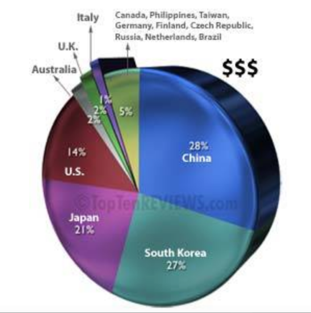 Though China spends more on porn than any other nation in the world (a whopping 28 percent of total pornography revenues compared to America’s 14 percent), this is only because of China’s enormous population of 1.3 billion people. In spite of the fact that porn is officially “illegal” in China, a country sometimes described as “a land where porn doesn’t exist”, the Chinese appear to have easy access to pornography imported from Japan.