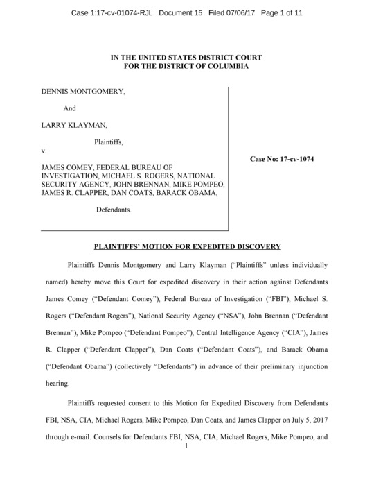 Klayman Moves Court to Take Oral Testimony of Comey, Clapper and Brennan and FBI, CIA and NSA in Illegal Mass Surveillance Case Before DC Federal Court. Seewww.freedomwatchusa.org