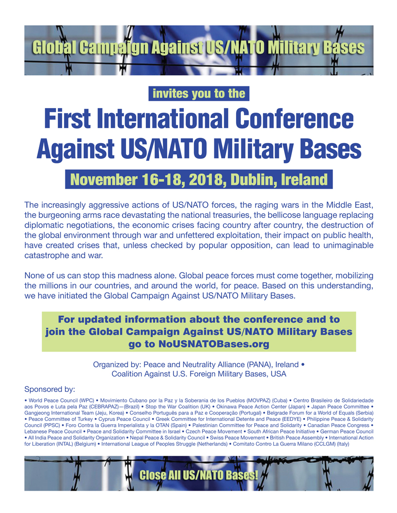 PLEASE REGISTER AND SUPPORT OUR INTERNATIONAL CONFERENCE IN DUBLIN, IRELANDDear Friends of Peace, Justice and the Environment,The registration process for our International Conference Against US/NATO Military Bases in Dublin, Ireland, is now open.