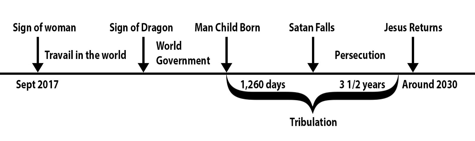 On September 23rd 2017 there will be a sign in heaven that fulfills revelation chapter 12 a great wonder in heaven a woman clothed with the sun and the moon under her feet and a crown of 12 stars giving birth to a man child giving birth to Jupiter. This event unlocks the meaning of revelations and will start a sequences of events that will begin from the year 2017 and lead to the beginning of the tribulation around 2025 or 2030 but within our lifetime.