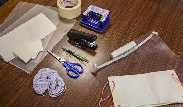 Before you read on any further, make sure you have at least one roll of hygiene-certified paper towels, heavy-duty tissue paper, elastic bands, a hole punch, paper tape, scissors, plastic-coated steel wire, a pair of glasses, plastic file folders, and binder clips, as pictured below: