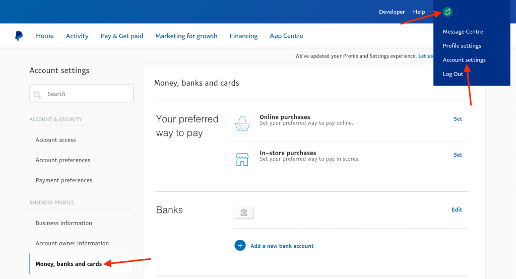 To review outgoing pre-approved payments for a PayPal Business account on the PayPal website, open your account settings and select “Money, banks and cards” > “Manage pre-approved payments.”