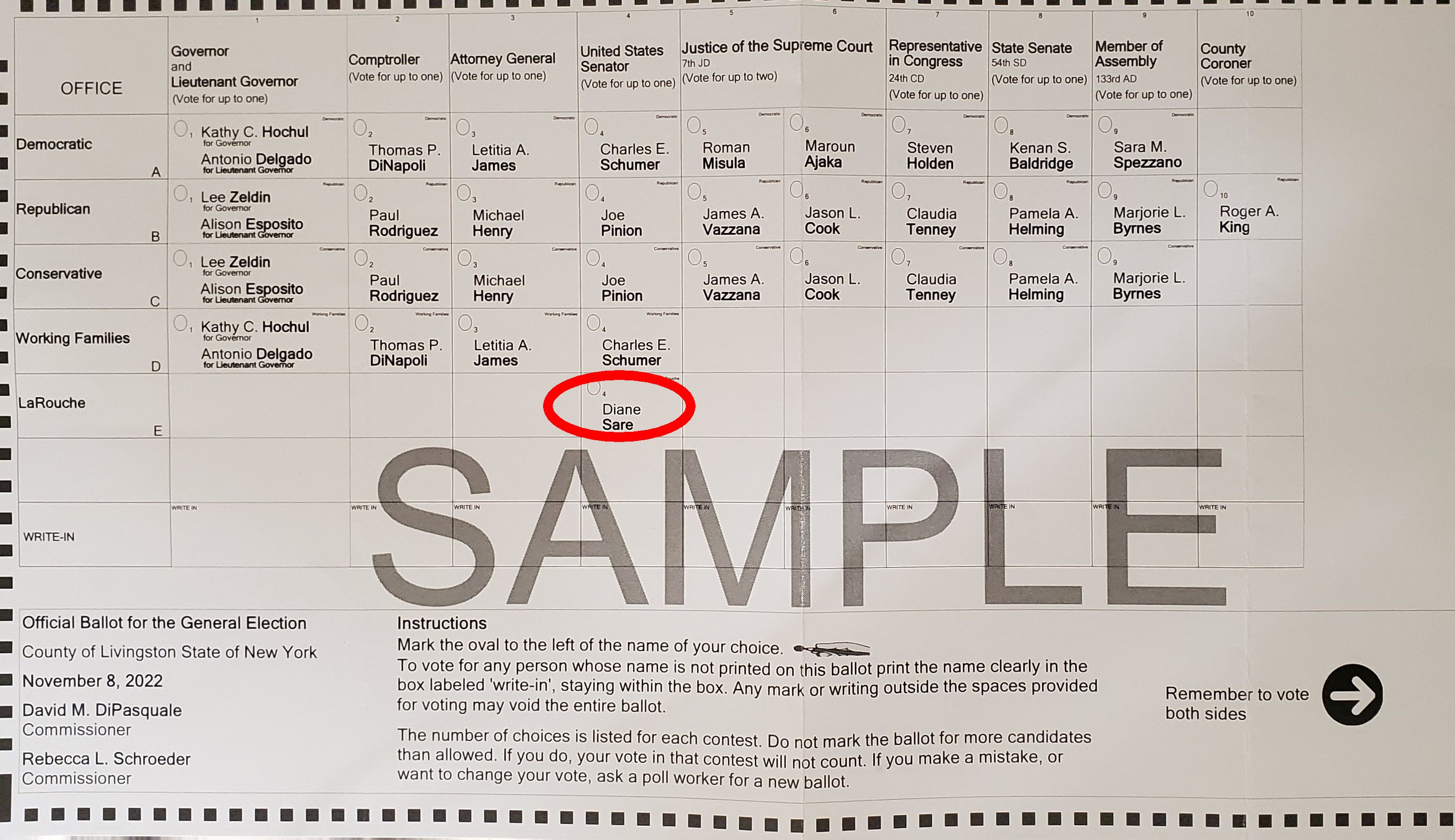 Diane Sare is on the November 8th ballot in New York State as the “LaRouche Party” independent candidate for U.S. Senate.