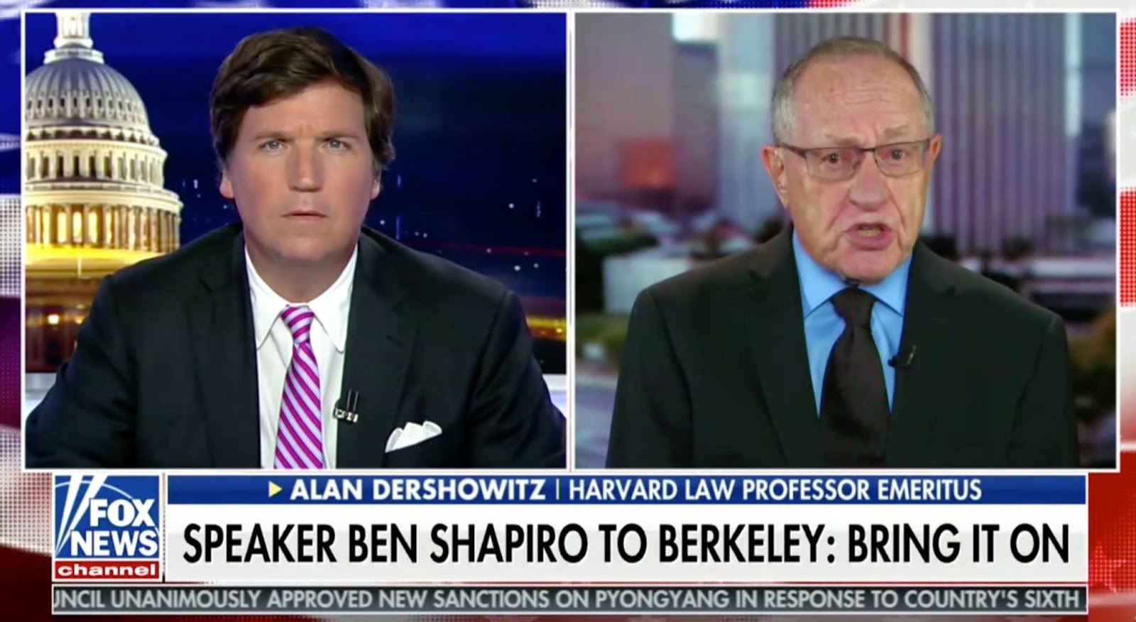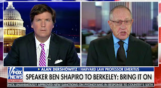 Another connection is Dershowitz’s loyal support for his protege Shapiro on Fox News on the issue of Shapiro speaking at UC Berkeley. Threatening to sue Berkeley if they didn’t let Shapiro speak there.