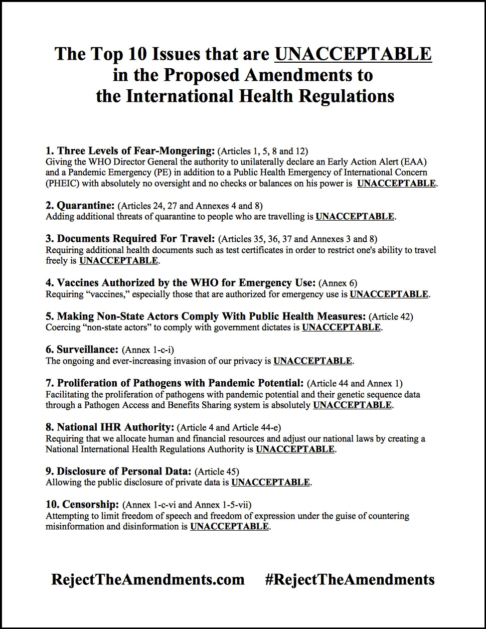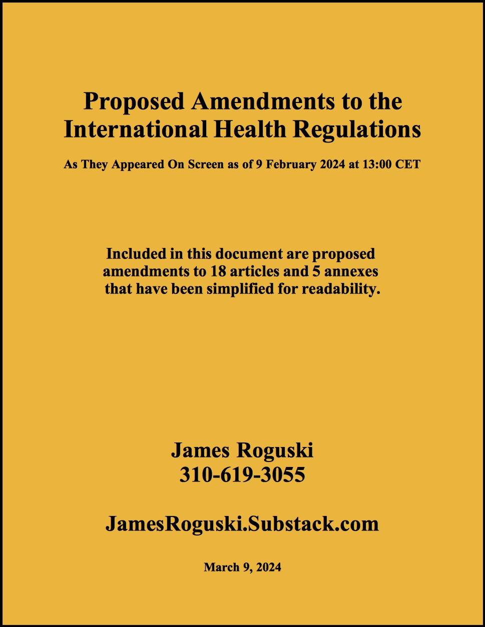 I have tried to make this as simple as possible. All that I am asking you to do is to share this article with everyone you possibly can.Contact me (James Roguski) directly at 310-619-3055 if you have any questions. The 77th World Health Assembly is scheduled for May 27 to June 1, 2024.The most important action you can take is to review the information below so that you are aware of what is really going on in these negotiations. GET YOUR FACTS CORRECT.PLEASE SHARE ACCURATE INFORMATION.Review the information below and share this article with everyone you possibly can so that everyone can become more aware of what is really going on. The proposed amendments to the International Health RegulationsWatch this video about the amendments:https://rumble.com/v4i968r-reject-the-amendments.html Click on the image below to download it to your computer, phone or tablet. Share it far and wide.Download the PDF, print it out and share it far and wide.