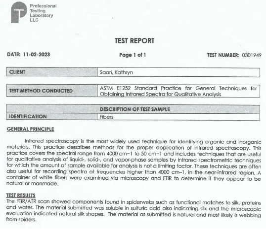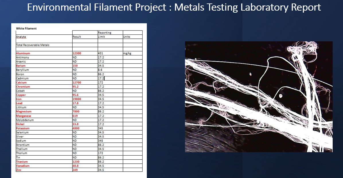 Image: Spider silk specimen as received I recently did an interview with Reinette Senum, during which she asked me if I would help with furthering the investigation of “Spider Silk” found in Jamestown, California, suspected to come from geoengineering operations. Kathryn Saari had already done Infrared Spectra for Qualitative Analysis. The conclusion was that this is natural spider webs. Here is the report: Polymers have been sprayed via geoengineering operations for decades. I have shown multiple previous examinations of similar white environmental filaments. Optically they absolutely do not look like spider webs for they are much thicker and more durable. The above conclusion that this is “natural spider silk” is unsatisfactory to me. Here is the environmental metals analysis that Clifford Carnicom did years ago, showing the classic metals used for geoengineering weather warfare: I have also shown the french analysis from 2012 showing the exact same whitish filaments sprayed via weather warfare geoengineering operations. Image: Environmental filament sprayed via geoengineering projects prior to analysis from France However spider silk is a polymer has been deployed and developed since 2002 Nexia Delivers Recombinant Spider Silk by a Canadian Biotechnology company, Nexia.