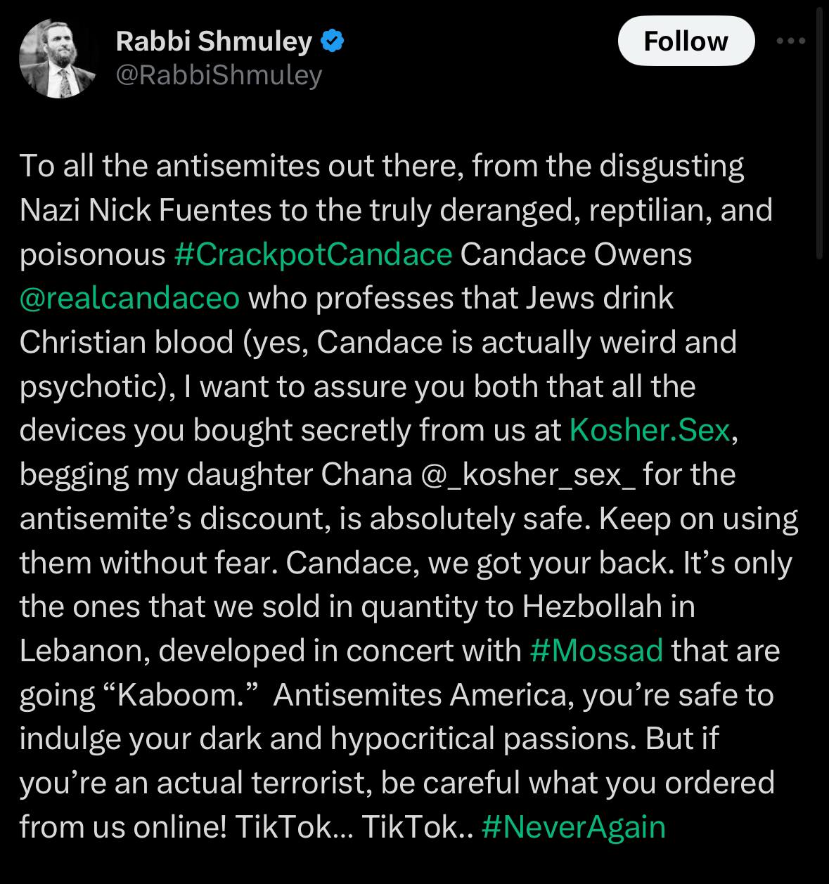 Rabbi Shmuley has put out a very weird post ensuring the public that the buttplugs he sells won’t explode in your ass. According to the Jew he only sold the exploding ones to Hezbollah operatives. He also claimed that various people who don’t like Jews in America secretly purchased his buttplugs and ensured them that they are safe to use.