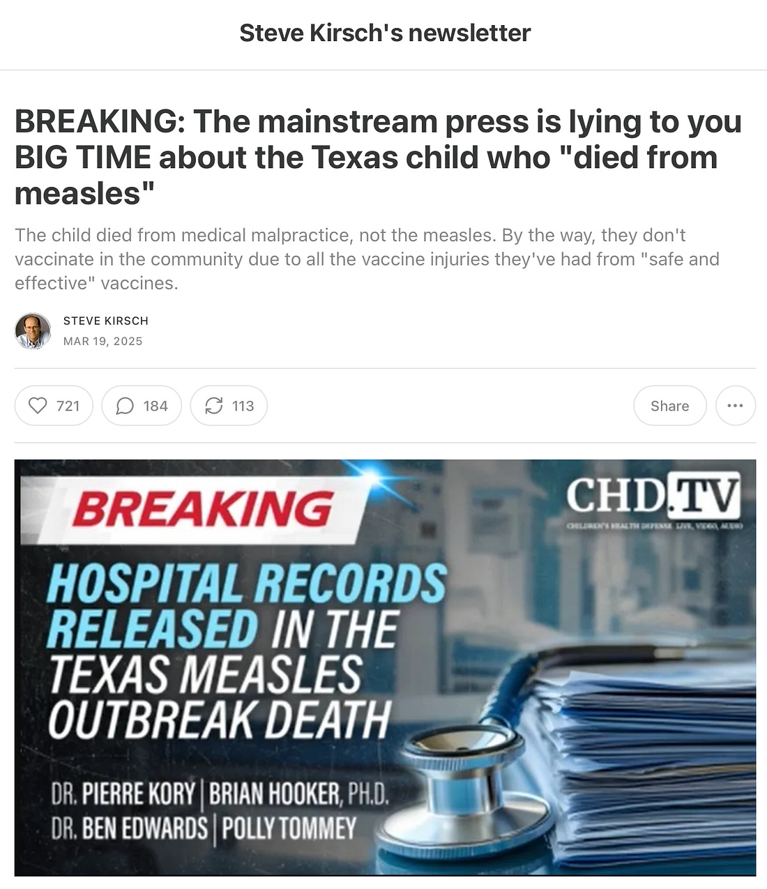 I’m quite certain MWD is part of a dark-force operation commonly referred to as “controlled opposition” and it appears that billionaire Steve Kirsch, Dr. Pierre Kory, Dr. Joseph Mercola and members of Bobby Kennedy’s Children’s Health Defense/MAHA (hereinafter “CHD”) are all on MWD’s team. These are the people who promote MWD’s work and I could not help but notice that Steve Kirsch recently published a substack article promoting “breaking news” from Children’s Health Defense about the fake child measles death in Texas which “news” included “expert testimony” from Dr. Pierre Kory (who, by the way, is a huge proponent of ultrasound).
