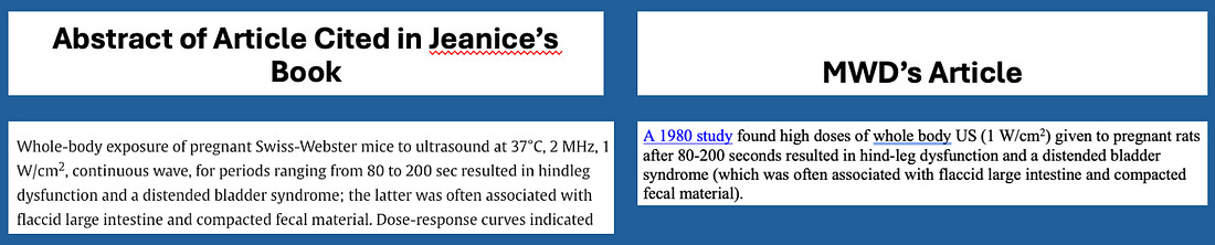 MWD next links to a 1980 study which is the Stolzenberg torture study that created paralysis in mouse pups. This study is citation #930 in my book, referenced on page 153. In this case, MWD was not interested to share the information about ultrasound causing paralysis with her readers so instead of copying what I wrote in my book, she copied the study abstract almost verbatim.