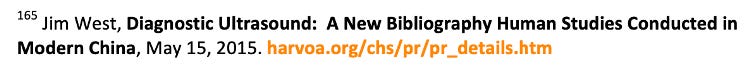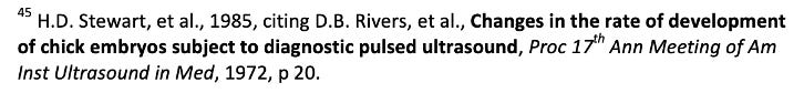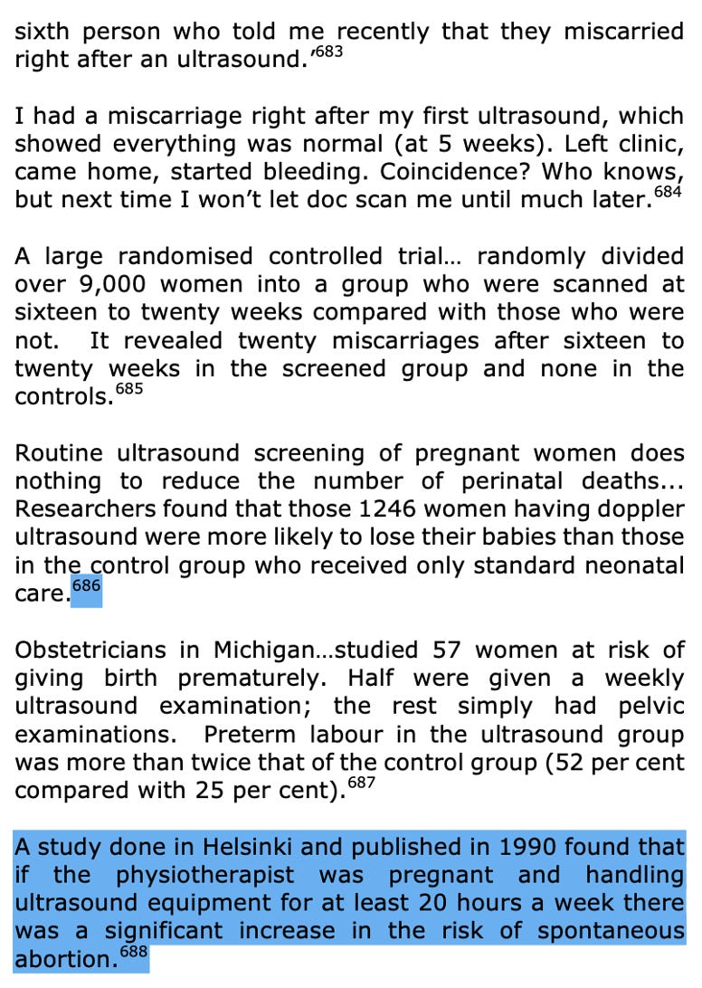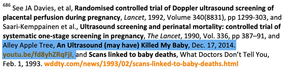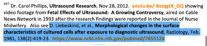 Notice that, in the sentence above regarding “sporadic other reports of mothers” whose babies were killed by ultrasound, MWD links to a video that is quoted on pages 109 and 110 of my book as citation #s 683 and 686. As can be seen in the screenshot below, this particular citation contains multiple other references concerning fetal death from ultrasound exposure. Below is a screenshot of the full citation with the video that MWD linked to highlighted in blue.