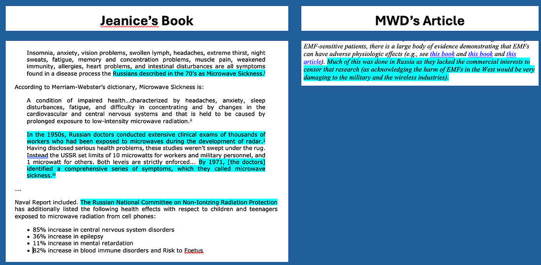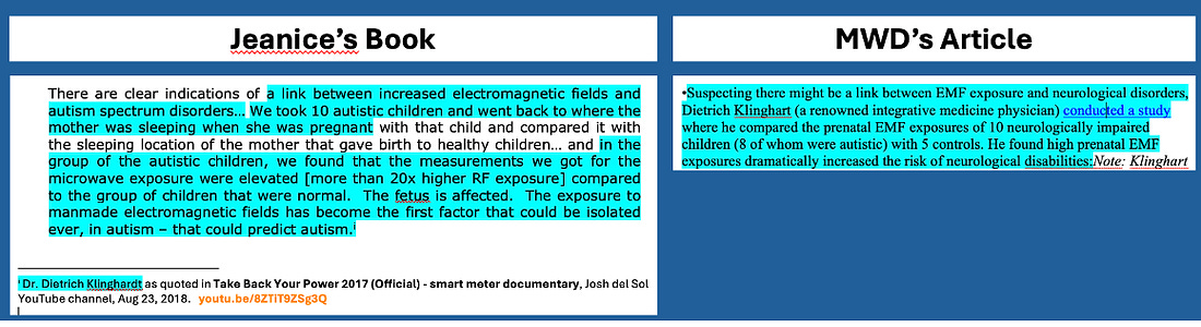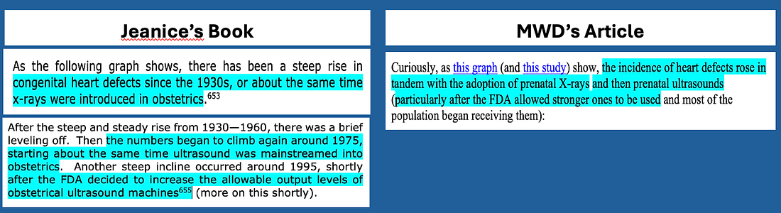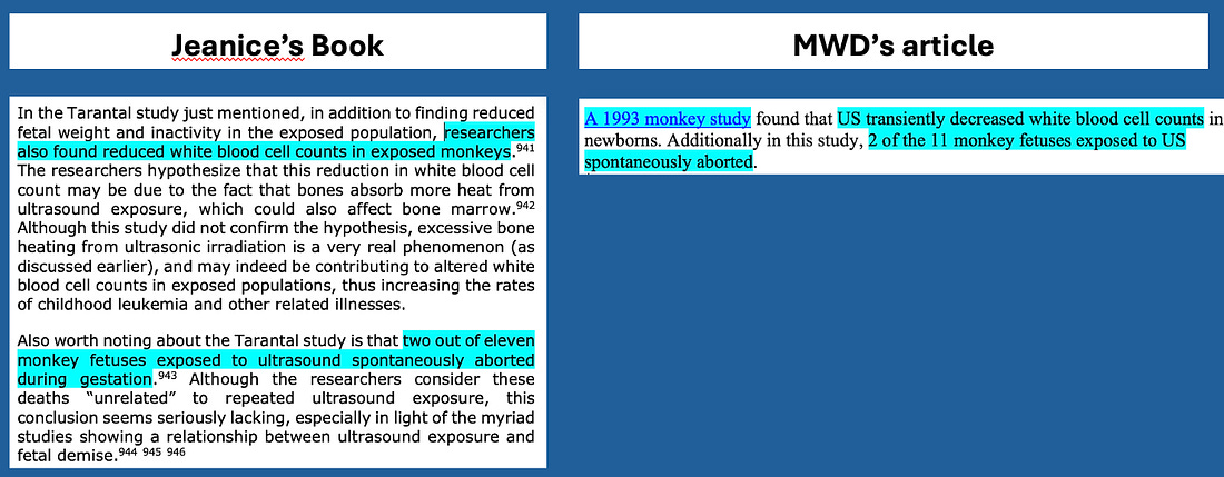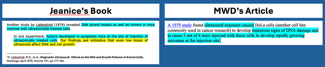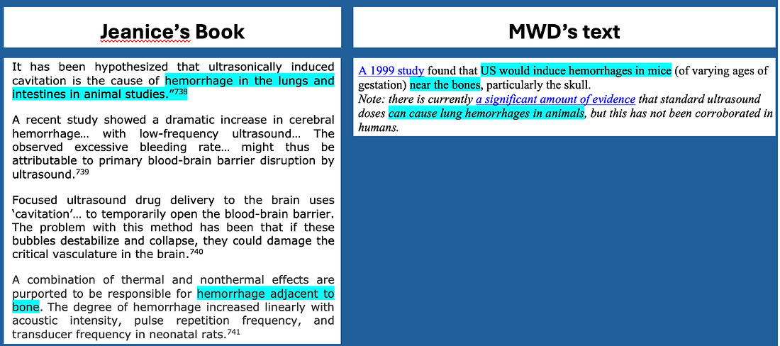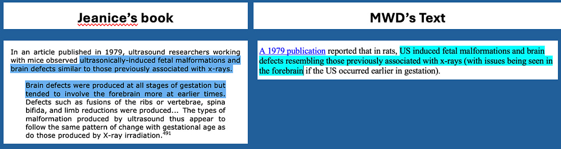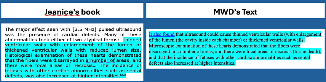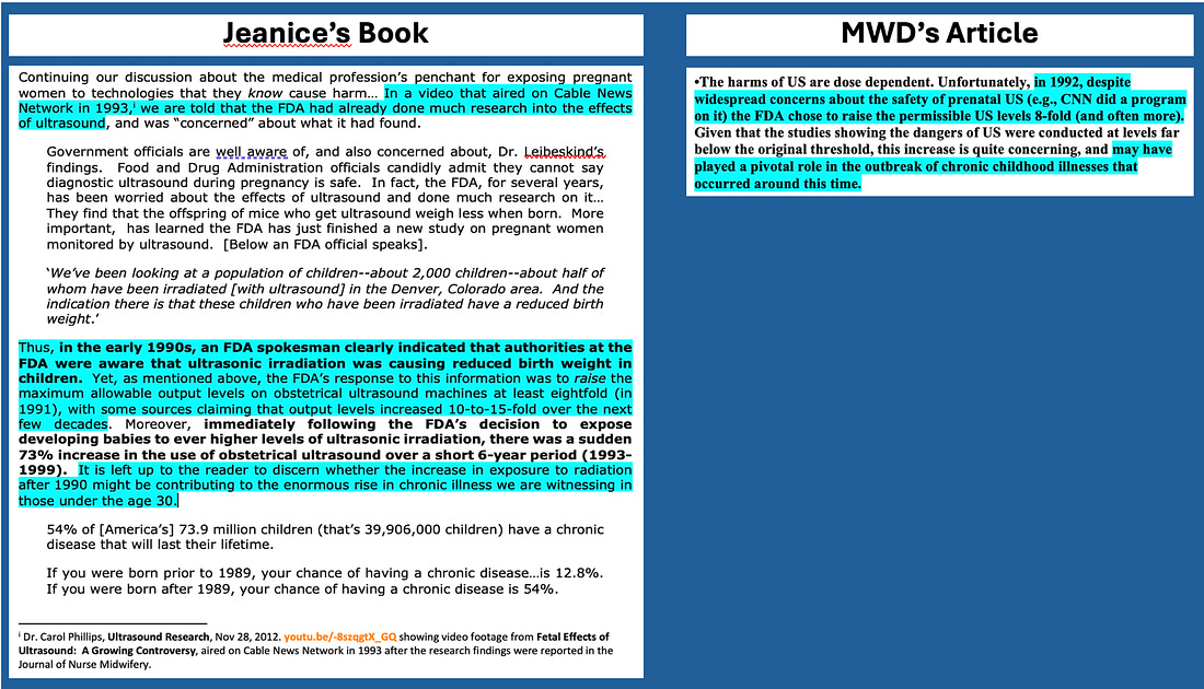 In MWD’s fourth paragraph, she mentions a CNN “program” (actually it’s a youtube video) that I quote and cite several times in my book. After mentioning this “program”, MWD also “spontaneously” decides to mention the FDA’s choice to raise output levels on ultrasound machines 8-fold AND that this might be connected to a rise in childhood illnesses. Below is a screenshot of where MWD got the “spontaneous” idea to put all of this in one paragraph. Information on the left is from my book, pages 143-144.