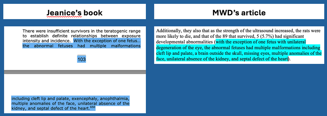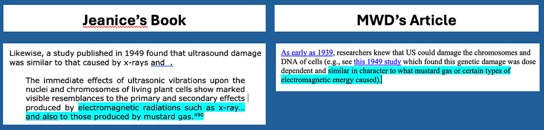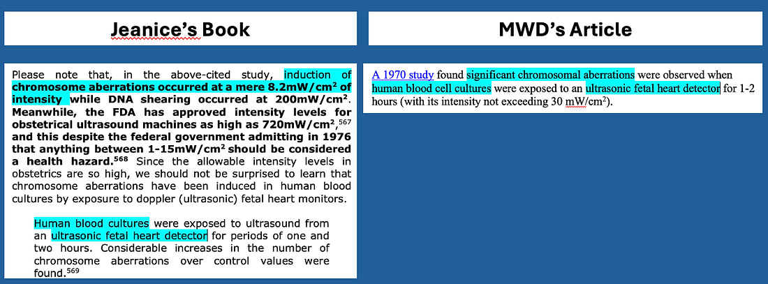 The next study MWD links to is another Macintosh study (1972) regarding chromosome aberrations being induced through ultrasonic irradiation. This study is citation #558 in my book discussed on page 91. Interestingly, MWD makes an error here and offers a synopsis based on a totally different Macintosh study – i.e., the 1970 Macintosh study just mentioned above. Despite her error (representing a clear indication that she has no idea what these studies actually say), her synopsis offers us yet another example of plagiarized text from my book.