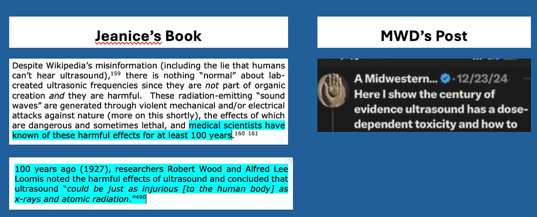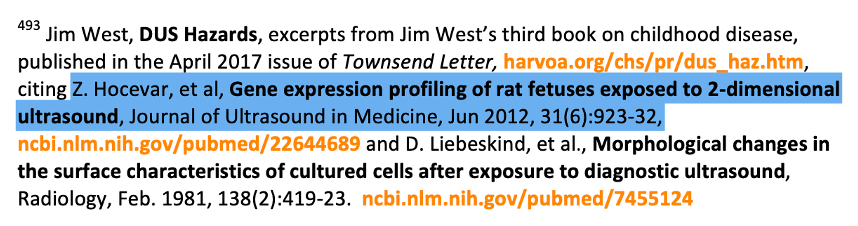 As will be shown below, almost everything MWD wrote in the post above came directly out of my ultrasound book save for the industry lie that ultrasound damage is “dose- dependent”. I debunk this lie in great detail in my ultrasound book while MWD is eager to promote it as part of her service to the disinfo group she works for and with (more on this shortly).