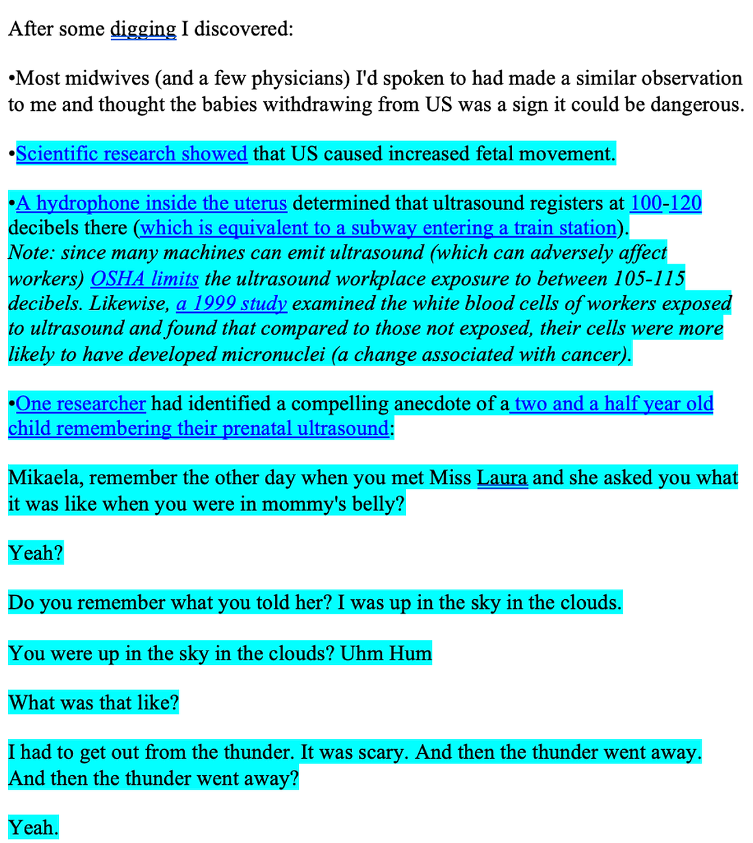 To begin the exploration, and especially for those who doubt that MWD might be guilty of plagiarism, I invite my readers to consider whether it does not seem odd that MWD would “spontaneously” decide to write an article about the dangers of ultrasound and then follow it up with another article about the dangers of hospital birth (she refers to these two articles as a “series”).