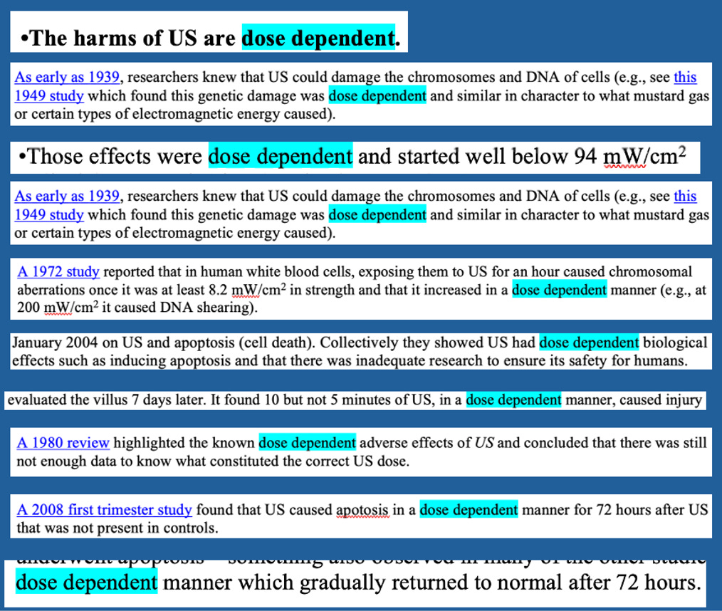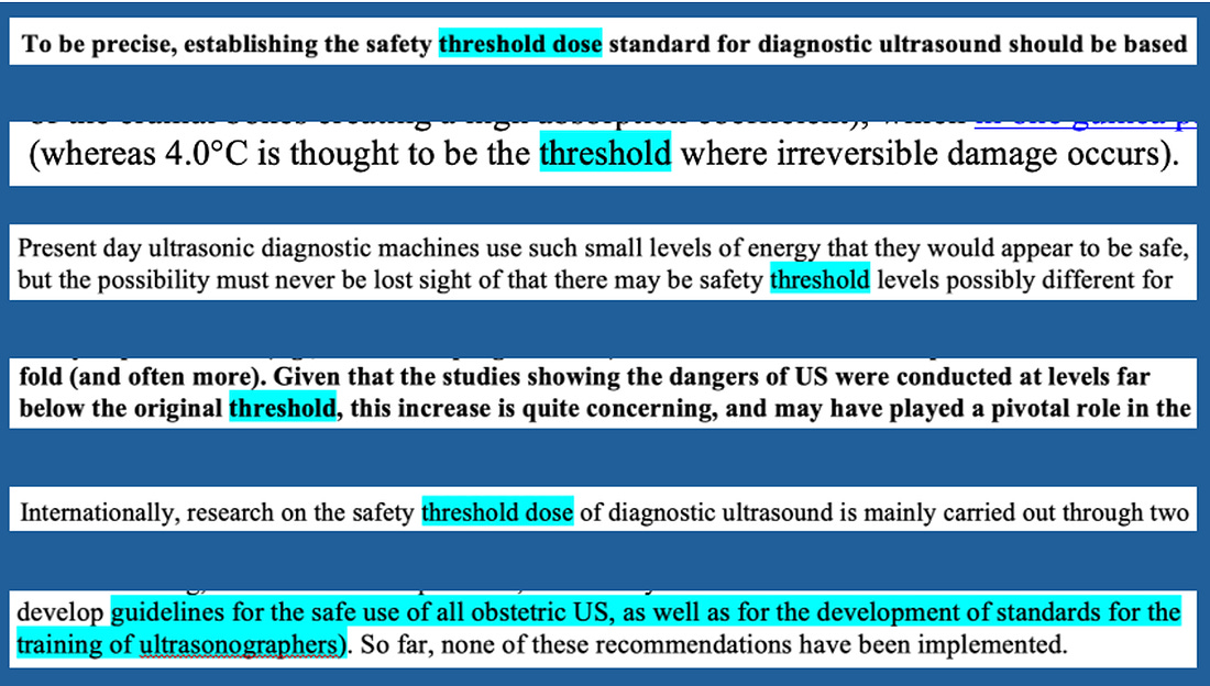 If MWD is not parroting the “dose dependent” lie, she is repeating the words “safety threshold” implying that there is a “safe” level of exposure to ultrasound which there is not. She is attempting to get people to believe that if we do not surpass this non-existent “safe” level of exposure, all will be well. Again, this is an insidious industry lie.