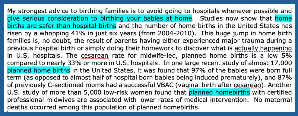 My birth trauma book also contains information about why home birthing is a better option than hospital birth. Below is an excerpt from pages 162-163 of my birth trauma book.