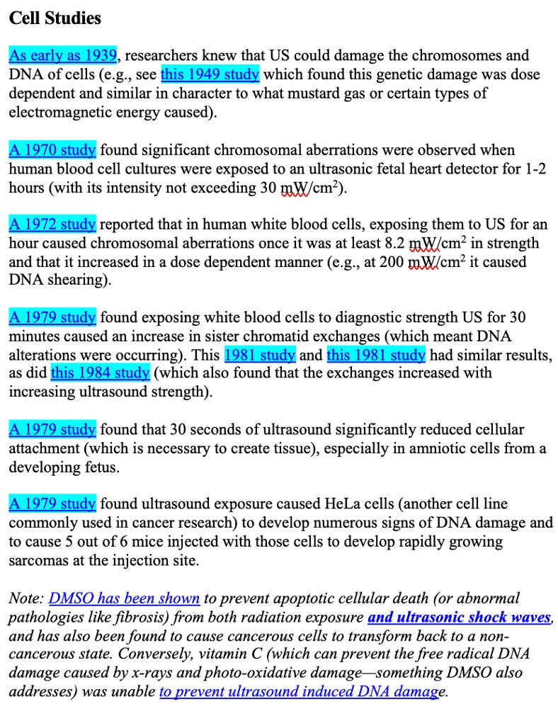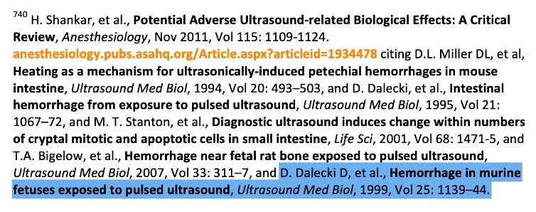 It is important to point out that citation #740 includes multiple studies including the Dalecki study, all of which confirm that ultrasound causes hemorrhage in animals (amongst other issues). MWD heisted almost every single study from this one citation in my book and linked to them, one right after the other, in her article. Below are screenshots of the myriad studies MWD linked to, all coming from a single citation in my book.