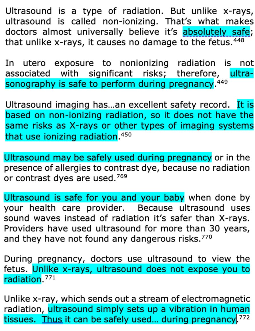 So, if we never hear the medical establishment claim that ultrasound is “effective”, the question arises as to why MWD repeatedly uses the vaccine mantra “safe and effective”. The reason is, I believe, that MWD is subtly trying to mimic a phrase that I use repeatedly throughout my book regarding the medical lie that ultrasound is “perfectly safe” for use during pregnancy. Here are a few screenshots from my book.