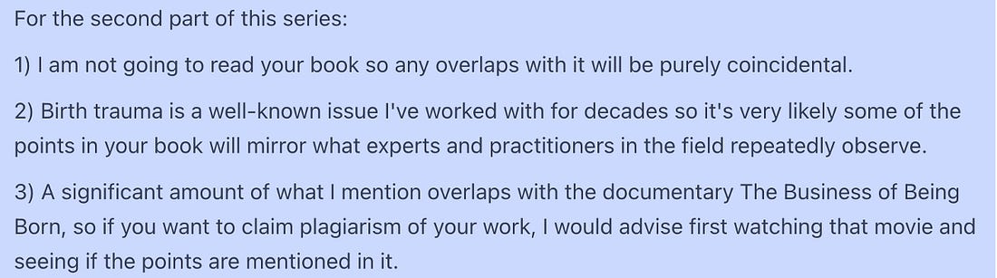 Below is a screenshot of MWD’s response to me when I called her out on her plan to steal information from my birth trauma book right after she stole information from my ultrasound book.