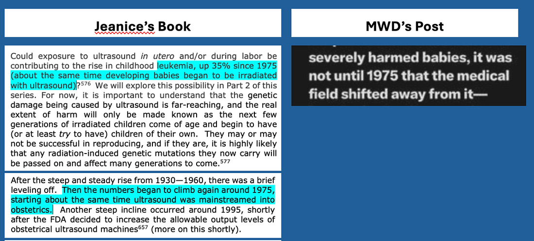MWD took this information from page 101 of my book where I discuss the fact that, after pregnancy x-rays were shown to be causing cancer in children, the medical establishment still did not want to give up their ability to peer inside the womb. Along these lines, I share a quote from an old video interview with Dr. Robert Mendelsohn in which he mentions an ultrasound study done by Dr. Alice Stewart that found that developing babies exposed to ultrasound have an excess incidence of leukemia. Dr. Mendelsohn then states that ultrasound has replaced x-rays in terms of the damage it is doing in creating childhood cancers. MWD changed the wording in my book slightly to avoid plagiarism detection and as we shall soon see, MWD does this again and again throughout his/her article.