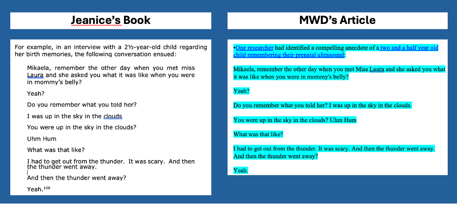 Despite MWD’s assurance that my book would have nothing to do with her article, after a quick glance, it does appear there are parallels between MWD’s hospital birth article and my birth trauma book. One such parallel is shown below.
