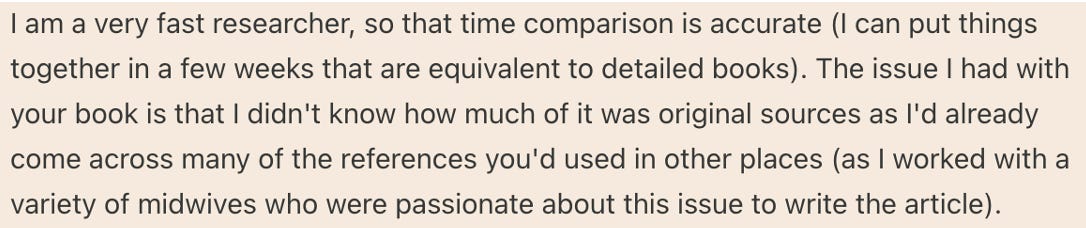 As you can see from the screenshot above, MWD claimed that she was not going to read my birth trauma book prior to writing her hospital birth article and that any similarities between my book and her article would be “purely coincidental”.