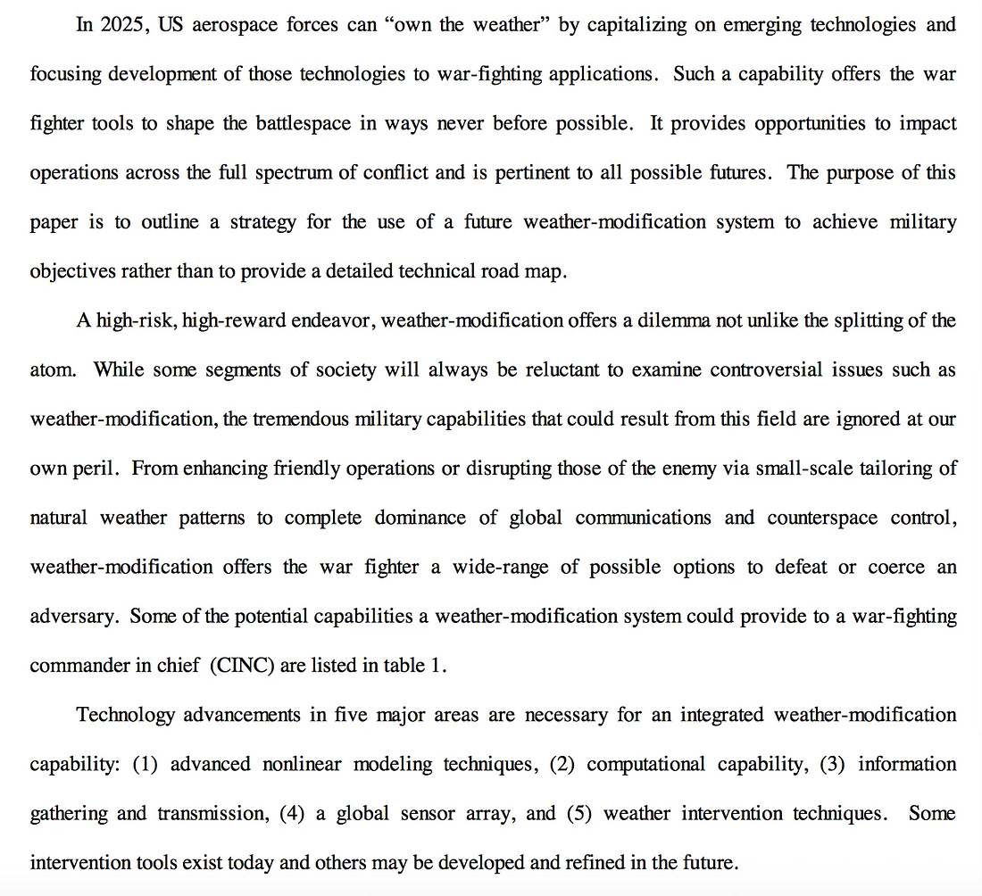 Weather-modification, according to US Air Force document AF 2025 Final Report,