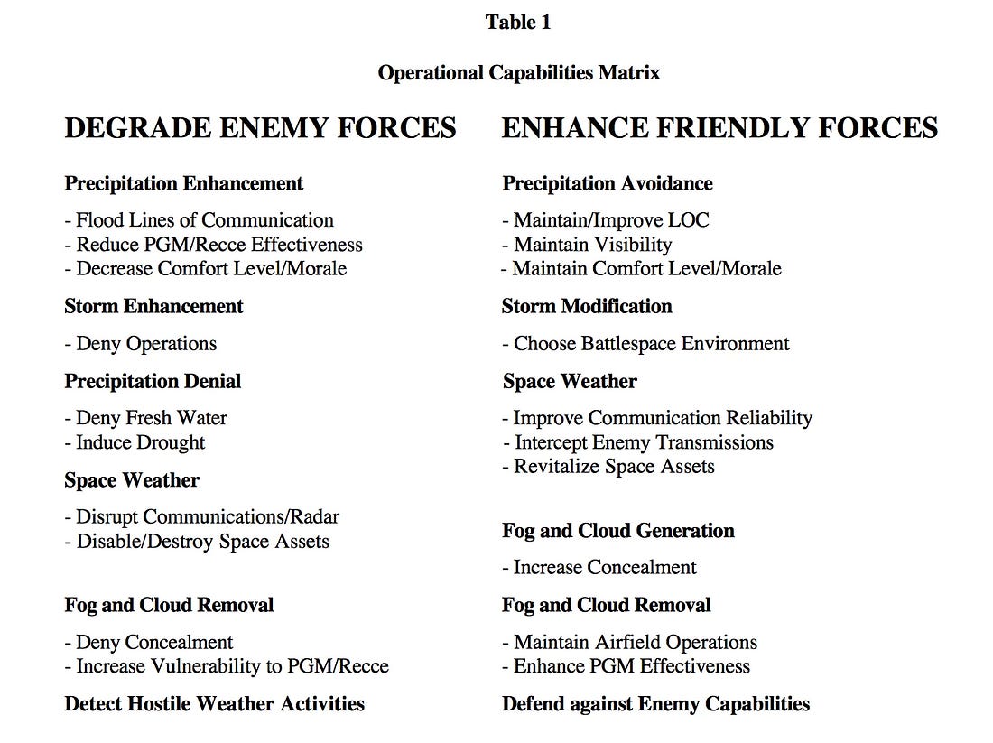 “offers the war fighter a wide range of possible options to defeat or coerce an adversary”, capabilities, it says, extend to the triggering of floods, hurricanes, droughts and earthquakes: